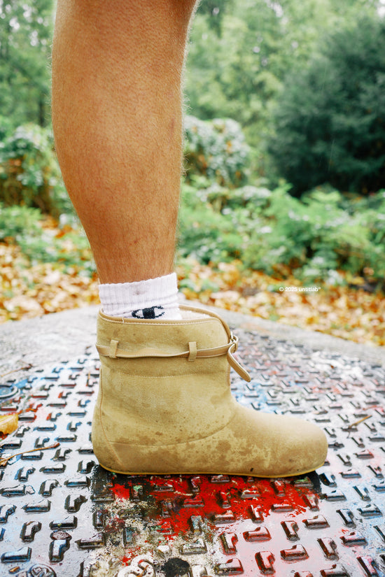 Belts Clogs Boots, introduced as a new style for the season, reinterprets the classic snow-boot silhouette with a thin outsole that creates a sense of ease and agility. Its foldable shaft, accented with a lamb-textured buckle, adds a subtle lift to winter styling. The Swift Trek Vintage Racing Boots draw on retro, nostalgic aesthetics to explore diverse perspectives, while the Reel Fisherman appears in a bright, expressive gold colorway that highlights a more progressive visual attitude.