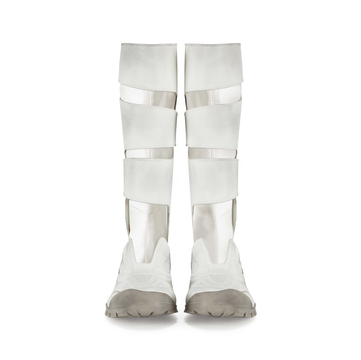 The white boots feature intentional pre-stained and scuffed details